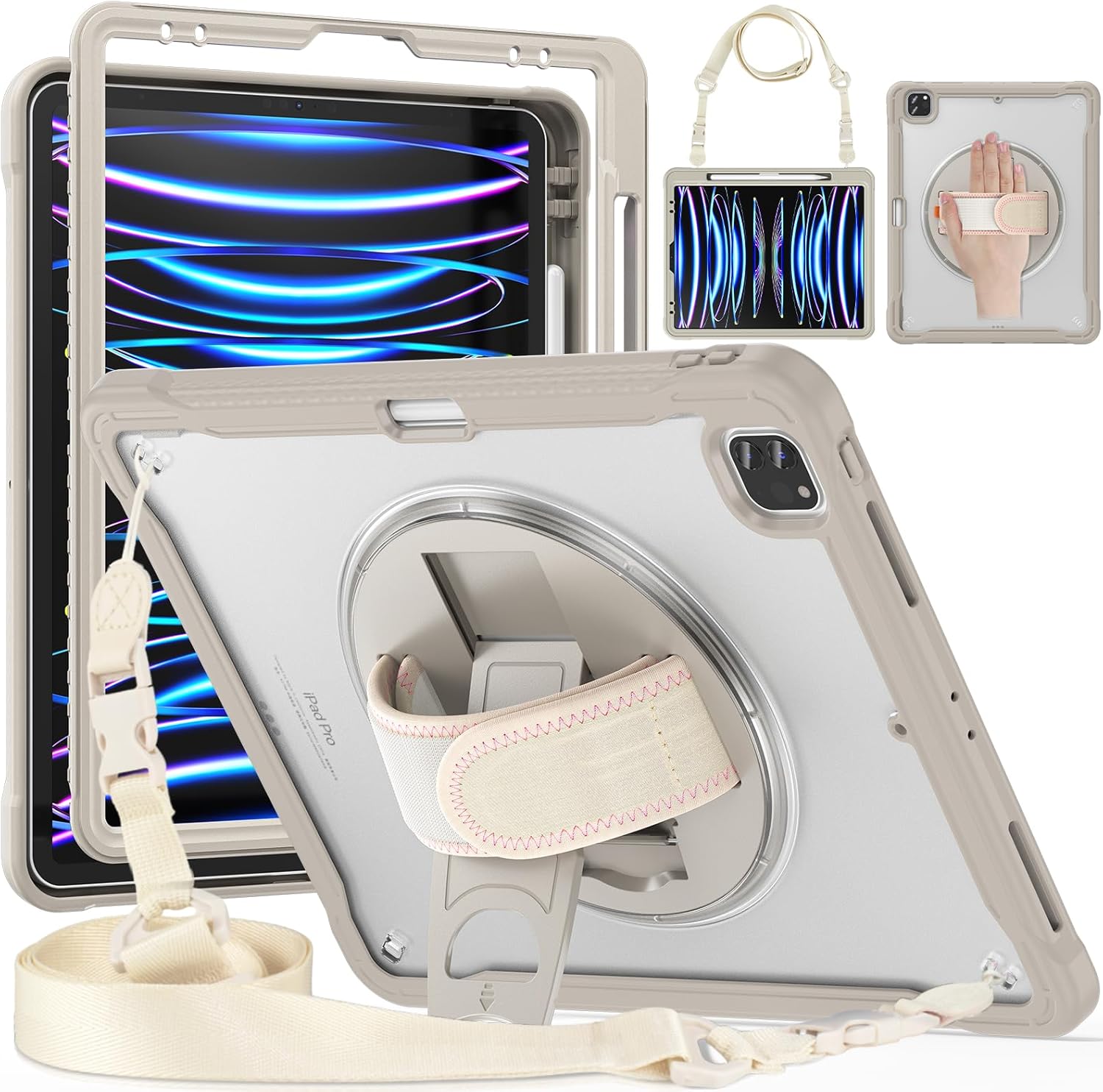 COMPATIBILITY: ONLY for iPad Pro 6th, 5th, 4th & 3rd Generation Case 12.9 inch 2022, 2021, 2020 & 2018 Model: A2764/A2437/A2766 A378/A461/A2379/A2462 A2069/A2232/A2233/A2229A2014/A1895/A1876/A1983 Note: Apple Pencil Not Included! please find the model number of your tablet to prevent buying the wrong tablet case, as different cases fit different models of iPads. Features: 360° Degrees Rotatable Kickstand: The stand can be rotated 360 degrees to keep iPad Pro 12.9 inch standing steady at multiple angles, freeing your hands and providing a flexible and comfortable angle for viewing or typing. Ideal for indoor and outdoor work, study, entertainment, etc. Shockproof & Drop-proof: The Shockproof TPU back transparent PC case wraps the Tablet to prevent Tab drops, bumps and ground impacts, Protecting the Tab, showing its excellent safety. 360°Degree Rotation adjustable hand strap: Adjust the elasticity of the strap according to the size of the adult/kids hand. The hand strap helps to hold iPad well to prevent drops and rotate the strap for free angle viewing and use. 360° Adjustable /Detachable Shoulder Shoulder Straps: Adjustable/removable shoulder strap, easy to install and remove. Easy to carry iPad Pro case when going out to play or work/study, hands free easily, shoulder straps can be hung anywhere, can be hung behind car seats for Kids to watch videos. Package Contents: 1 x Rotating Kickstand Case for iPad Pro 6th, 5th, 4th & 3rd Generation Case 12.9 inch 2022, 2021, 2020 & 2018 1 x Shoulder Strap