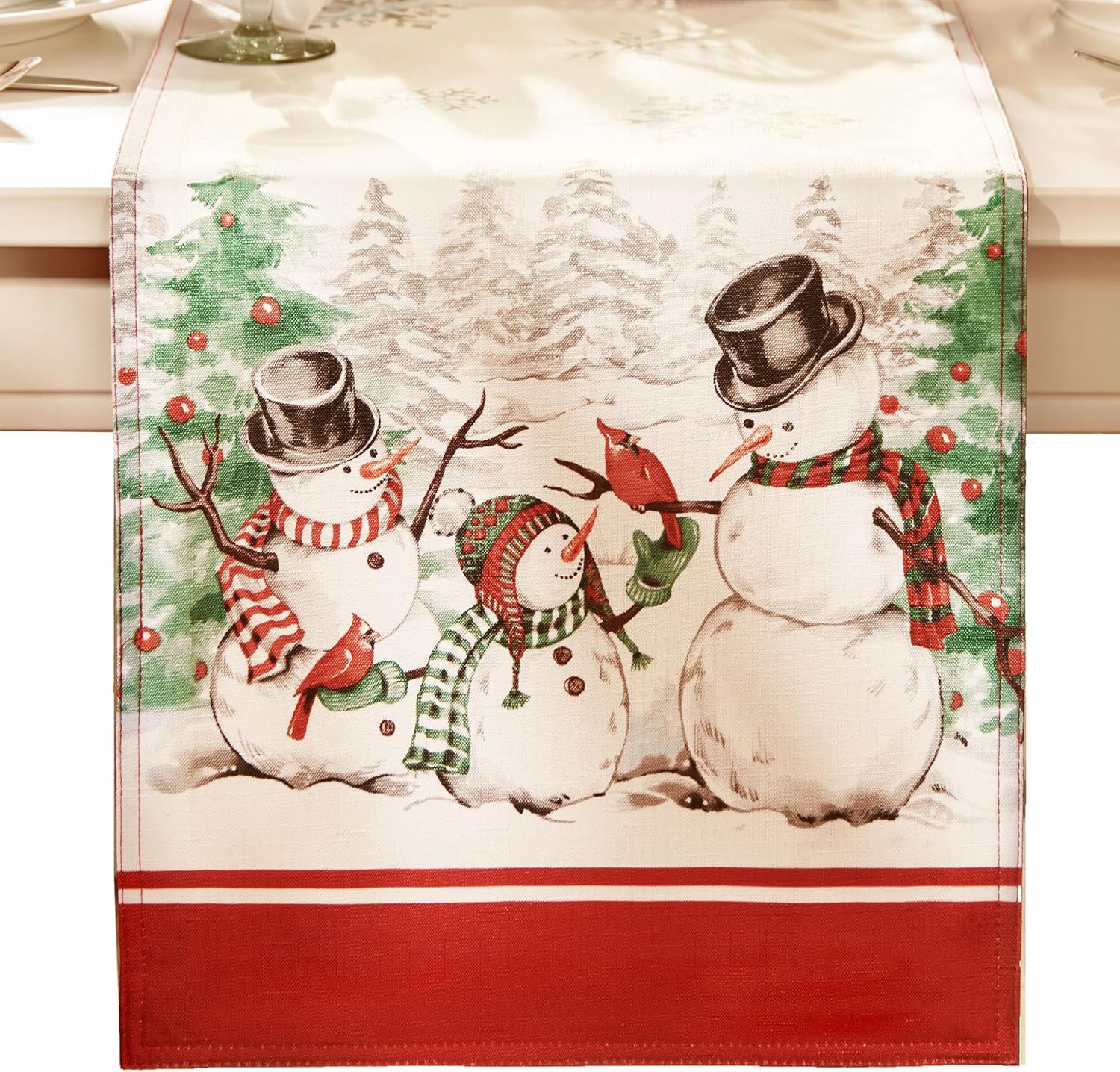 Elrene Home Fashions provides fashionable home decor to suit any decorating taste. Share a meal in style with family and friends with our Snowman Winterland Holiday Snowflake Tablecloth. Perfect for family gatherings or as a Christmas party tablecloth, this festive table cover is sure to impress guests and family alike. Pair it with our matching napkins, runner, and placemats to add a touch of vintage seasonal fashion and simple holiday elegance to your home.Made from 100% polyester, this tablecloth has a delicately hemmed edge for a polished look and added durability. Its colorful, seasonal-themed design includes an adorable snowman print with Christmas trees in a lovely forest scene featuring shades of gray, red, and green with black outlining to highlight the pattern’s details on a crisp white background. This tablecloth has a wonderful texture and enough weight to lie perfectly centered on your table and is available in a variety of shapes, including round, oval, and rectangle, so you’re sure to find the perfect fit for your table. To keep this cloth table cover looking amazing, simply machine wash and dry it. It’s a lovely way to add a little fashion to your home this holiday season.Established in 1922, Elrene Home Fashions was founded on the principles of quality and guaranteed satisfaction. With the help of our expert artists and designers, we produce high-quality, fashionable home decor for every home and decorating palate. We are 100% committed to our customers and strive to give the very best in all of our products.