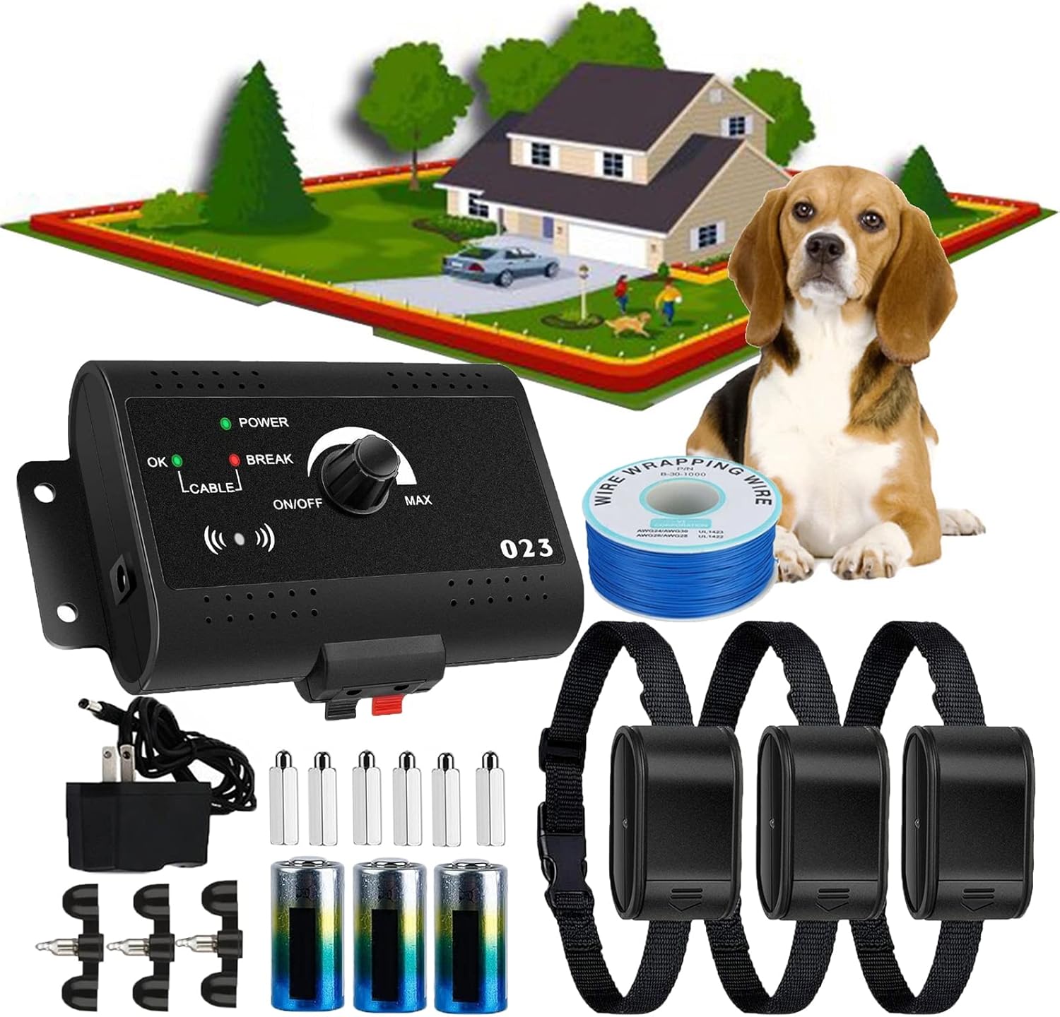 Product Description:The pet electronic fencing system is one of the reliable and cost-effective pet fencing systems available today. *Design your containment area and calculate the amount of wire needed.*Install the wall transmitter.*Lay out the perimeter wire.*Connect the perimeter wire to the wall transmitter.*Verify transmitter is functioning without problem.*Set up the receiver and then,test the containment system and adjust the field width.*Install the boundary wire and training flags.*Fit collars to your dogs and train your dogs.*There is a lightning protection device on the converter to avoid lightning strikes.Specifications:Product Type: Electric Dog Fencing SystemMaterials: ABSUS Plug Of Remote: 100-240VCollar Battery Type: 4LR44 6VRuntime Per Battery: 10DaysSuggested Wire Bury Depth: More Than 1in UndergroundTransmitter Size: 14.3x9x5cm/5.63x3.55x1.97inPer Collar Receiver Size: 6.5x3.5x3cm/2.56x1.38x1.19inPackage 1:boundary wire of 300 metres *1Package Two:Indoor Wall-mounted Transmitter *1Adjustable Receiver Collars w/Neck Straps *1Power Adapter w/ Charging Cable *1boundary wire of 300 metres *1Test Bulbs *1Extra Metal Contact Points *2Screw *4Training Flags *20User Manual *1Notes:*Only use it for dog,not any other animals.*Let your dog adapt to the collar before you start training. You should allow your dog to accept the collar as a part of her life.*When the collar in your dog,do not set the program.*Keep away from children can touch the place.